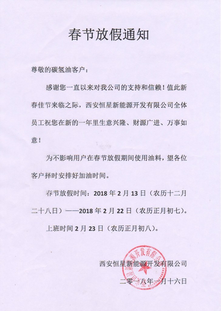 西安恒星新能源開發(fā)有限公司春節(jié)放假通知