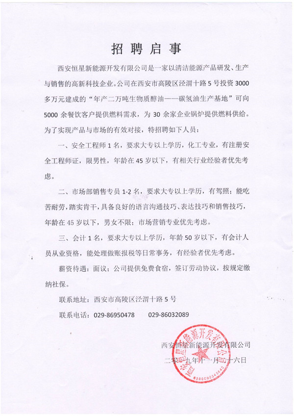 西安恒星新能源開發(fā)有限公司招聘公告